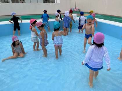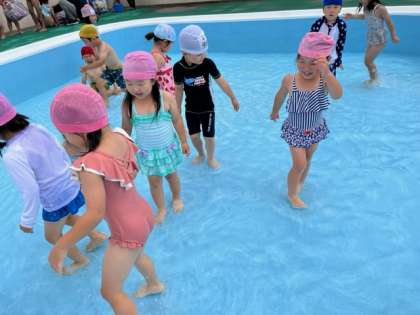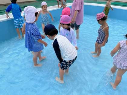 もも組も着替えて、プールを見にきたので 入り方を知らせたり、手をつないで一緒に歩いたりしました。また一緒に遊ぼうね。