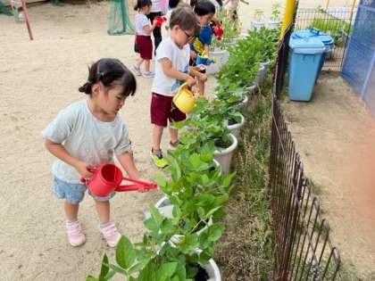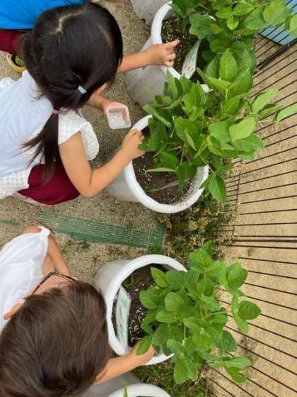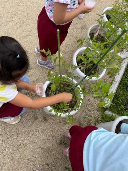 育てている夏野菜がだんだん大きくなってきているので、肥料を入れてあげることにしました。優しく肥料を入れて、水やりをしていました。休んでいる友達の分も進んで水やりをしてくれました。