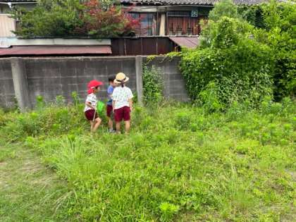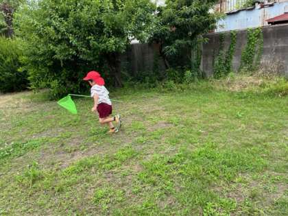 広い園庭には草がたくさん生えた場所もあり、赤ちゃんバッタがいたり、チョウチョウが飛んできたり、トンボが飛んでいたりして、自然がいっぱいです。虫あみや虫かごをもって、虫取りを楽しむ子どもたちが走り回っています。