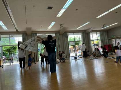 次は1枚の新聞紙をマントにしたり、てるてる坊主を作ったり、輪っかやボールを作って遊んだりしました。いろいろなものに変身させたり、たくさん貼り合わせて、セミナー委員さんが持ち上げると、子どもたちが大喜びでj通っていました。でも、だんだん破れて、ビリビリと破ったり、投げたり、雪のように頭の上から降らせたりして遊びました。