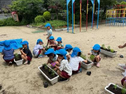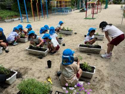 花咲かすみちゃん事業で、区役所の方からいただいた花の苗をプランターに植えました。自分たちで、ポットから苗を出し、根っこをほぐして、丁寧に植えていました。