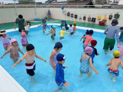 あお組は、プールでの水遊びも慣れてきていて、水もたくさん入れていたので、みんなで水の中を走って洗濯機ごっこで流れて遊んだり、浮き輪や水鉄砲を使って遊び、存分にプール遊びを楽しみました。