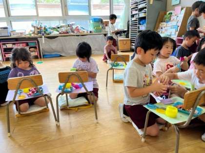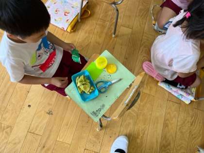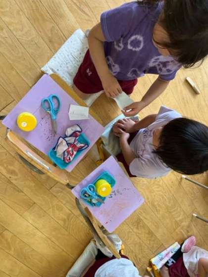 午後の遊びで、友達に教えてもらったり、一緒にしたりしながら、貝つなぎの笹飾りつくりを楽しんでいました。できるようになったことが嬉しく、何回もつくって、できたことを喜んでいました。