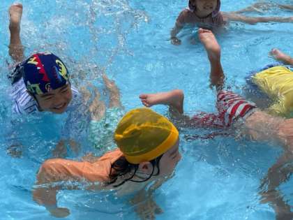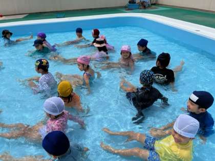 プールの中でお尻で歩いたり、ぐるぐる回って洗濯機ごっこで浮いたり、「今日はなんだかいっぱい動かない」「どうしてかな」と考えたりしていました。