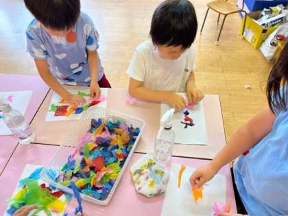 いろいろな色のお花紙を貼り付けて、霧吹きで湿らせ、二つ折りにしてしっかりと押さえ、乾かしています。どんなふうになるのかな。楽しみにしているあお組です。乾いてからのお楽しみですね。