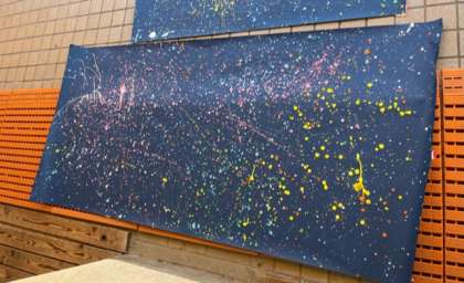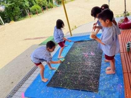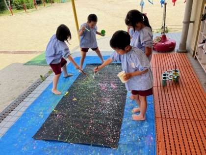 黒い紙に、筆につけた絵の具を振りながらスパッタリングをしました。夜の空に星がいっぱい散りばめられたような絵が出来上がりました。