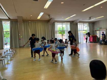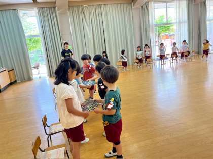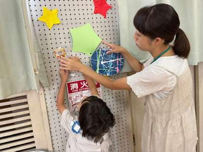 7月生まれの子どもたちはプレゼントにもらったうちわに貼る星を壁面の中から探し出しました。お家で貼って、星の模様をつけてね。