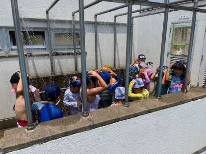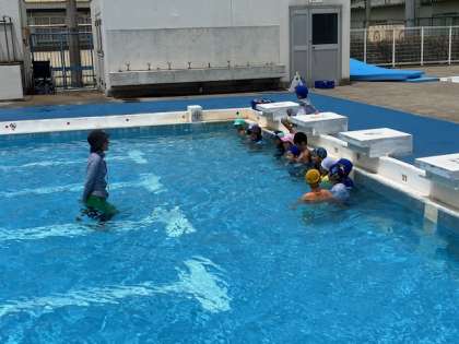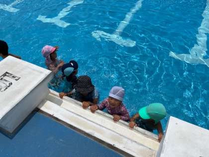 住吉小学校の大きいプールに入れてもらいました。見た瞬間には、「うわー、大きい!」とびっくりしていました。足が立つくらいの深さで、初めはこわごわプールサイドを持ってプールの端を歩いていました。あごはすぐにプールに着くので、顔をつけてみようとなりましたが、幼稚園のプールで慣れているので、平気で顔付けをしている子どもがたくさんいました。