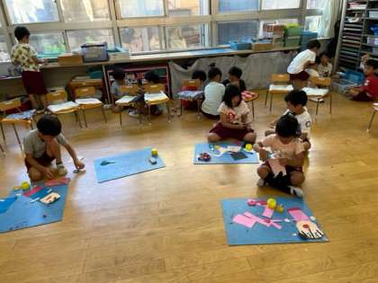 貼り絵や折り紙、つくるの大好き。自分で一生懸命に考えたり、友達と一緒に考えたりして、丁寧につくっています。
