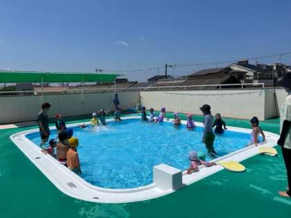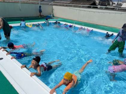 プールサイドを持って、足をバタバタ。顔つけもできる子が増えています。