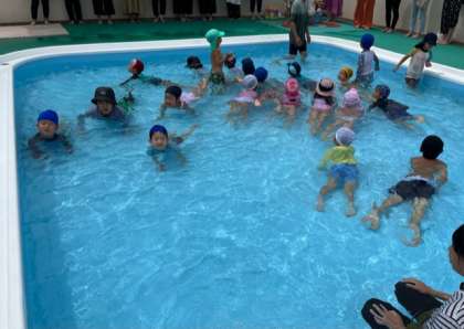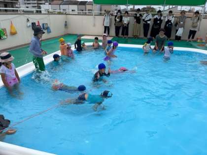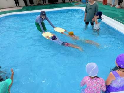 あお組は、みんなで走って水の流れを作って体が流れることを楽しんだり、プールの縁を掴んでバタ足をしたり、ビート板で体を伸ばして浮いたり、ロープをくぐったり飛び越えたり、自分なりに挑戦して、あお組になってできるようになったことをお家の方にみてもらっていました。