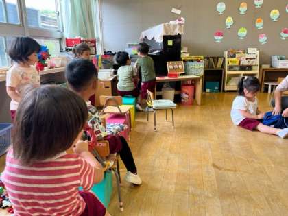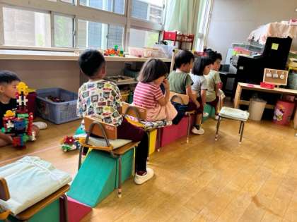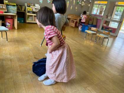 積木を並べたところに自分の椅子を持ってきて、「電車に乗ってください!」と嬉しそうに誘ってくれました。「運転手する?」と言うので、先頭を見ると、赤いハンドルが置いてあり、「ブーンってするねんで」と教えてくれました。カバンにご馳走を詰めて持ち、スカートも履いて、乗ったり降りたりしながら、電車ごっこで遊んでいました。