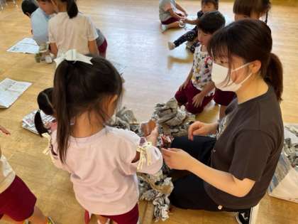 あか組が大きなカカシの土台になる部分を作り始めました。新聞をくしゃくしゃにして丸めて土台の体を大きくしていきました。「私がテープ切るわ」と、手でちぎって友達に渡して参加していました。土台ができたら、あお組に届けます。どんなカカシになるのでしょうね。