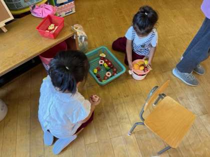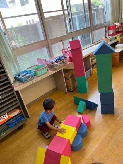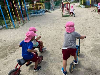 1人で大きな積木でお家を作ったり、友達にごちそうを作ってあげたり、一緒にスクーターやスライダー、三輪車に乗って園庭を走り回ったりしていました。