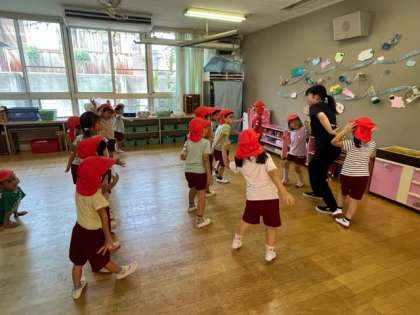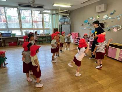 お魚のダンスはどんなのがいいかな?とダンスをして遊んでいます。海にどうやってもぐる?タコってどんな風に泳いでるのかな?とダンスを楽しんでいます。