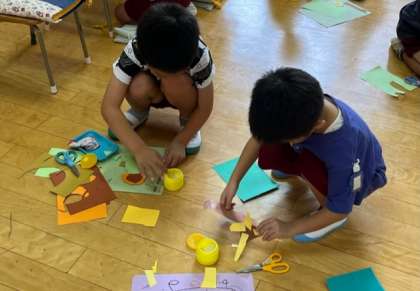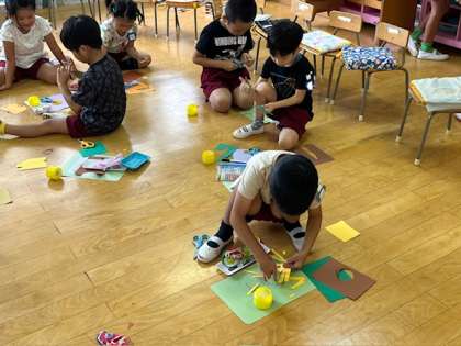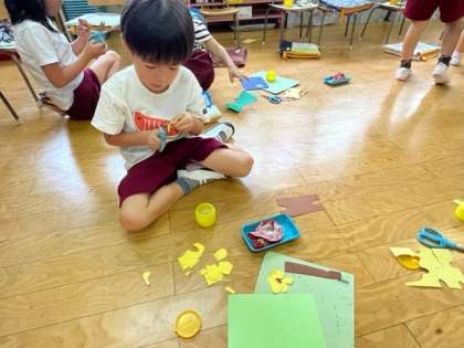 誕生会の自己紹介の台に貼るひまわりを作っていました。大小様々なチューリップが作られて、「あそこに飾るから」と教えてくれました。細かい花びらをていねいに切っていました。