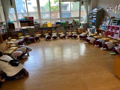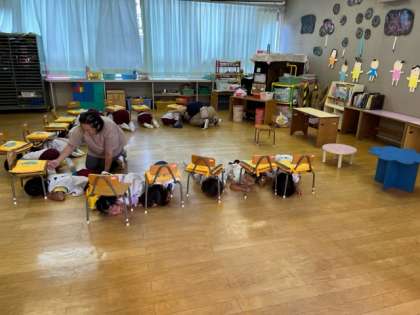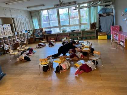 久しぶりの避難訓練でしたが、地震の想定で、合図があると、椅子の下に頭を隠していました。もも組は「泣いてなかったよ」と言っていました。