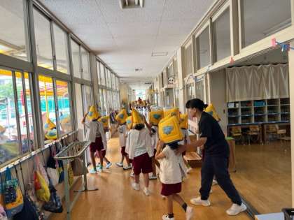 避難訓練 2・引き取り訓練 公開日 2023/09/01 更新日 2023/09/01 園の様子 防災頭巾をかぶり、園庭に避難しました。その後、2次避難で住吉小学校に避難していました。お家の方に幼稚園からのメールを受けて家を出発してもらいましたが、近くのお家の方はすぐに迎えにきてくださいました。みなさん、お家からの時間を測ってくださったり、本当に地震になった時のために、歩いて幼稚園まできてくださったりしていました。 ご協力いただき、ありがとうございました。 いいね(0)