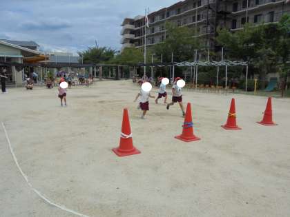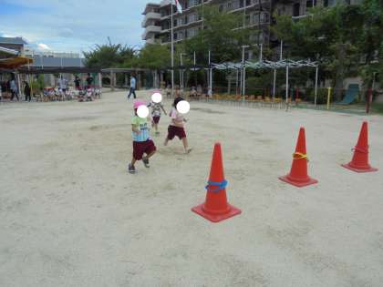 もも組とあか組で、かけっこをしました。円の中に入って、「よーい、どん!」の合図でスタートをして、ゴールのコーンまで走りました。一生懸命走る友達を「がんばれー!」と応援する姿も見られました。外で走ると、気持ちいいですね。