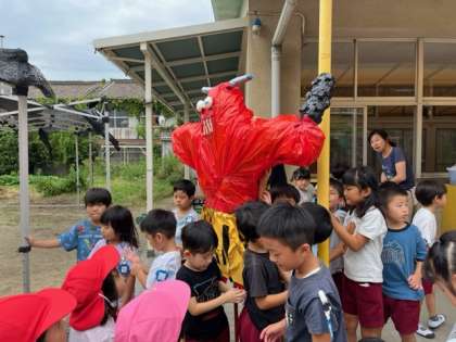 あか組が土台を作り、どんなかかしがいいかと言うことを考えて作ったかかしです。