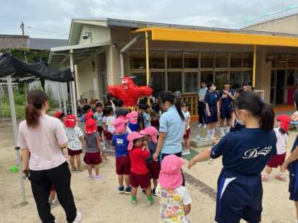 飾り付けができたことを、あか組に報告したあお組は、説明をしてあげていました。あか組は、「すごい!」「こわい」とびっくりしていました。