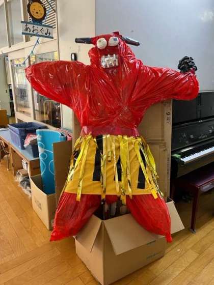 赤鬼がいいということで、つのをつけたり、金棒を持たせたりしました。これなら住吉大社の御田の稲を守ることができるでしょう!