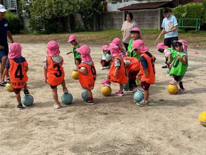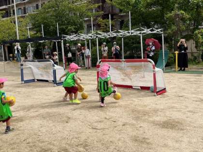 3回目のサッカー遊びで、コーチの話もよく聞いて、楽しんでいたもも組の子どもたち。保護者の方の参観もあり、頑張っているところを見てもらって、シュートも決めていました。