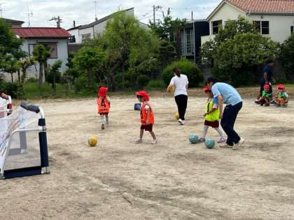 もも組から経験してきているあか組の子どもたちも、サッカー遊びを楽しみにして園庭にやってきました。ボールを使って、手に乗せたり足の間に挟んだりして、遊びながらゴールに向かってボールを蹴っていました。
