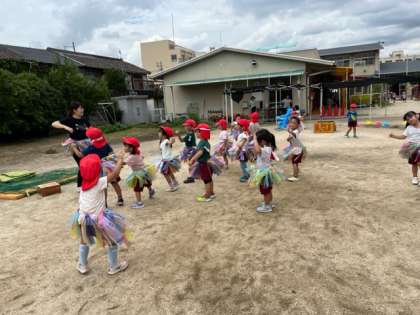 海を渡って南の島にやってきたあか組の子どもたちは、宝箱の中に素敵な衣装を見つけました。早速つけて、南の島のダンスを踊り始めました。波の表現をしたり、「アロハ」の挨拶をしたり、みんな、楽しそうに踊っていました。
