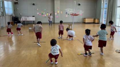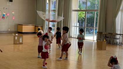 宇宙人から逃げたり、星のステッキで遊んだり、星に見立てた玉で遊んだり、楽しんで遊んでいます。先生の話からイメージを広げながら、自分でも遊びを考えています。今日もピカピカはなまるを渡すと、私、ピカピカになったと目を輝かせていました。