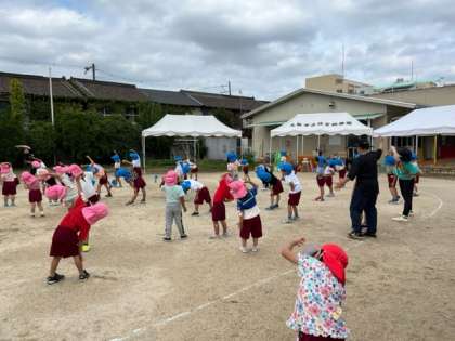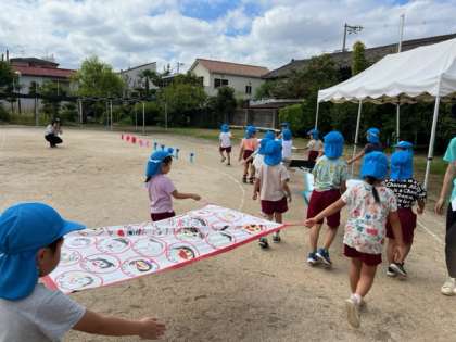 運動会ごっこをみんなでしました。もうすぐ運動会!と楽しみにしていました。自分の頑張りだけではなく、友達の頑張っているところも見つけて「すごいな」「かっこいい」「嬉しそうやな」と言って、応援していました。「あお組みたいになりたい」と憧れを感じながら、見ていました。