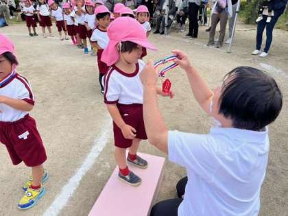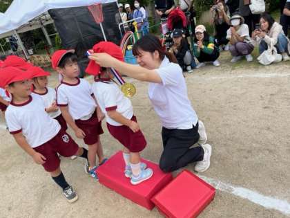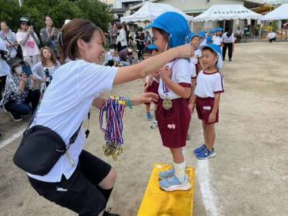 メダル授与式では、1人ずつ台の上に乗って、金メダルをかけてもらいました。金メダルをもらった子どもたちはとても嬉しそうに自慢していました。