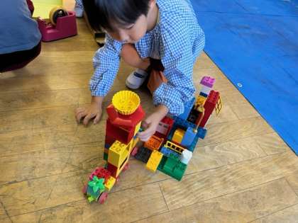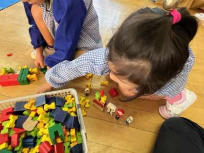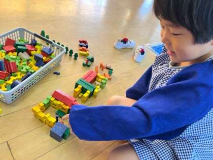 ブロックや積み木でおうちや車を作ったり、動物が鳴いたり、車掌さんが「出発!」と言ったり、お家の中で友達が遊んだり、自分たちで楽しいことを考えながら遊びが展開していきます。