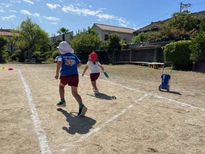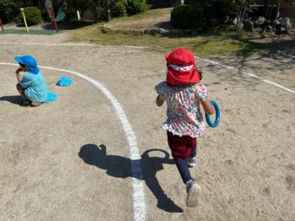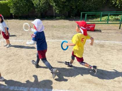 あお組がリレーをしているのを見て、「やってみたい」と、あか組もリレーをしてみました。走る前に「何するの?」と見にきたあお組が、リレーについて教えてくれて、始めました。友達からバトンを受け取り、一生懸命に走り、バトンをつないでいくことができました。