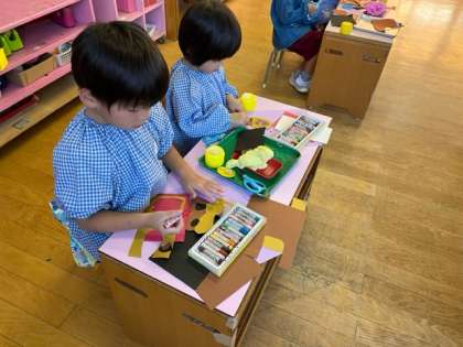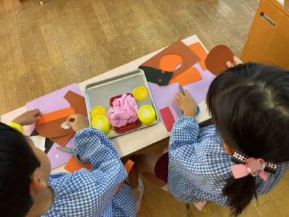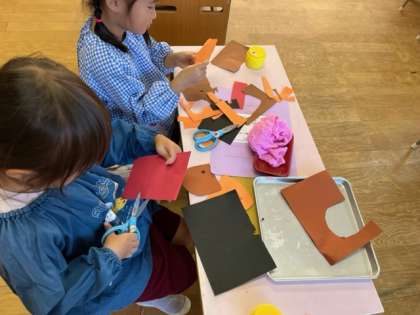 住吉大社で見たドングリを紙を切ったり貼ったりして作りました。ドングリや帽子を近くで見ながら、「丸いドングリもあるけど、長いのもあるで」「帽子はトゲトゲしてるねん」と、いろいろなことに気付きました。つくっているうちに、「これは私で、これはお母さんドングリだよ」と、たくさんつくって嬉しそうに見せてくれました。