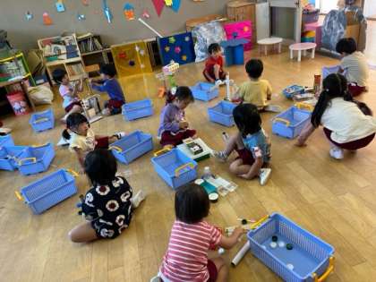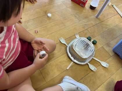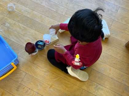 自分が好きなものを集めてきて、並べながら、「カメみたい、これお顔、しっぽはこれにしよう」と探してきたり、「きょうりゅうみたい、ながーい」と教えてくれたりしていました。