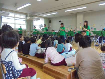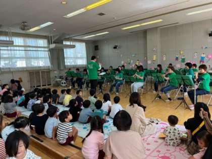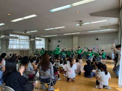 『マムズウインドオーケストラ クローバー』の皆さんが来てくださり、素敵な音楽を聞かせてくださいました。それぞれの楽器を知らせてくださったり、一緒に踊りながら歌ったりして、楽しい時間を過ごすことができました。