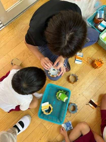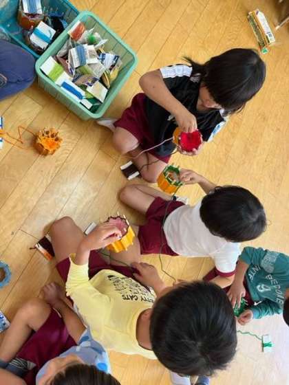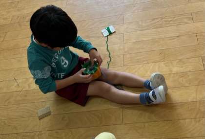 あお組は、毛糸を使って編み物を始めました。一つ一つの目をよく見ながら、少しずつ編んでいます。だんだんと長くなることを楽しみにして編んでいます。