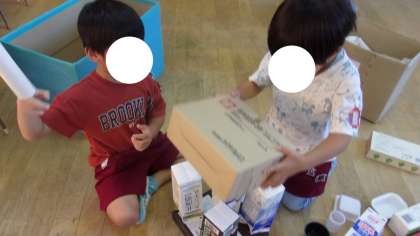 あか組はお家から持ってきてもらった素材を使って、何ができるかなといろいろ試しました。「タコの足は8本やから、たくさん長いのがいるなあ」「友達と一緒に船つくってん。ここにエンジンもついてるよ」と、つくりながら話してくれました。これからどんなものができるか楽しみですね。