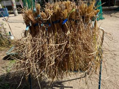 ハサミで根元から切り、紐で括ってから、鉄棒にかけて干しました。お日様に当てて、さらに美味しいお米になるようにします。