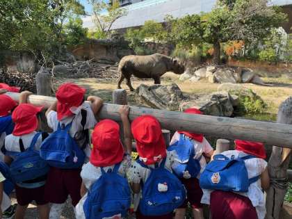 アシカを間近で見てビックリしたり、サイがご飯を食べているのを喜んだり、「お尻に尻尾があるよ」と発見したことを教えてくれたりしました。近くで見たり、匂いをかいだりして、動物の様子に笑顔になる子どもたちでした。