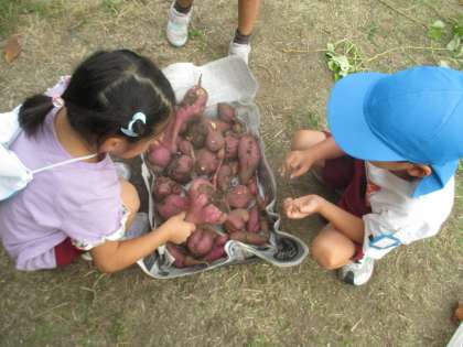 みんなで掘ったお芋を見ながら、「何個あるかな?」と数えたり、「焼き芋したいな」「幼稚園みんなの分あるかな?」と話をしたりしていました。