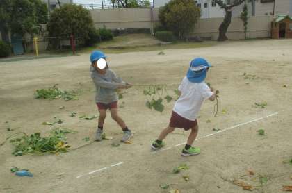 お芋の蔓は、力いっぱい引っ張っても切れないので、綱引きをしていました。