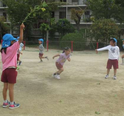 長い蔓は、長縄跳びに。「走り抜けできるやん!みんな〜集まって!」と友達を呼んできて遊んでいました。途中、蔓が切れてしまったのですが、「くくったら、また長縄できるやん」と気付き、結んで何度も回して楽しんでいました。