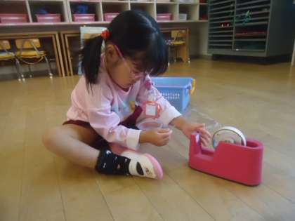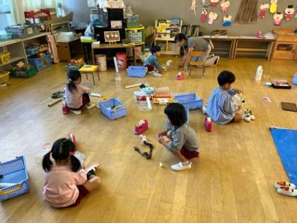 自分でしてみたいことを見つけて、つくったりかいたりして遊んでいます。素材の中からいろいろなものを探して組み立てたり、みたてて考えたり、絵をかいたりして楽しんでいます。