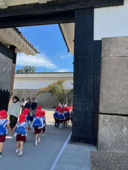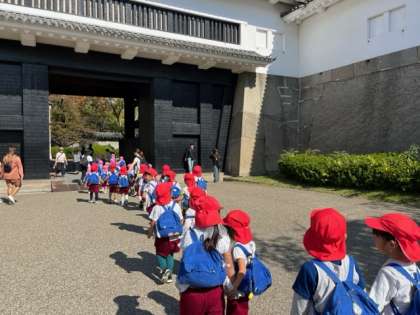 電車に乗る時はあお組に手をつないでもらって大阪城公園に着きましたが、公園内ではもも組も友達と手をつないで歩きました。大きな門をくぐって天守閣の見えるところまで頑張って歩きました。