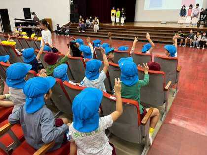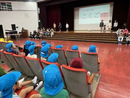 住吉小学校2年生の子どもたちが、住吉幼稚園と住吉保育所の年長児に、小学校の授業について教えてくれました。国語、算数、音楽、掃除、休み時間、給食など。あお組は一生懸命に見たり聞いたりしていました。「小学校のれい!ってお辞儀するねんな、0じゃないねんな。勉強って面白いな」と言ったり、クイズに答えて「やっぱり、そうやんな」と喜んでいたり、「小学校楽しみになってきたな」と憧れをもって見たりしていました。