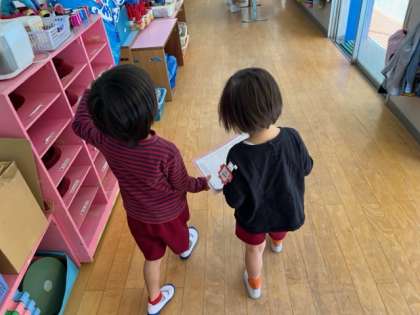 毎日、朝に、おやすみの友達は誰かな?とみんなで確かめています。その後、保健室に当番の子どもたちがお休み調べを届けてくれています。もも組も友達と一緒に届けていました。