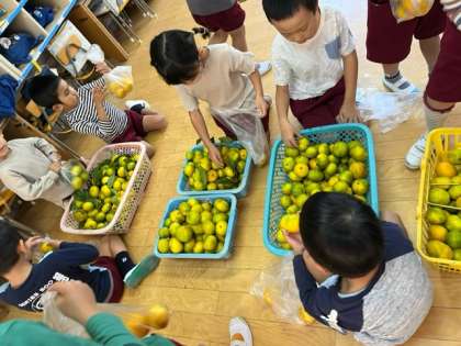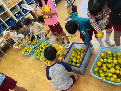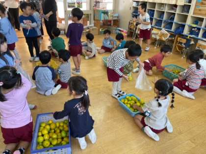 「幼稚園のみんなに分けられるね!」と大喜びの子どもたち。ですが、黄色のミカンと緑色のミカンが混ざっていることに気付きました。「緑は酸っぱいんちがう?」「美味しくないかも」と心配になり、みんなに分ける数から分別してくれました。自分たちの分を年齢と同じ5個ずつ袋に入れていきました。そして、あか組ともも組を、あお組ミカン屋さんに招待することにしました。