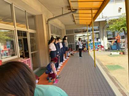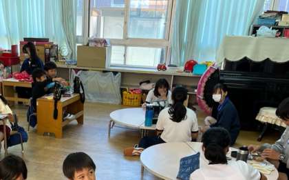 保護者にも職場体験を知らせて挨拶したり、預かり保育の子どもたちと一緒に弁当を食べたり、「おにご(おにごっっこ)しよう」と子どもたちから言われて、園庭を走り回っていました。